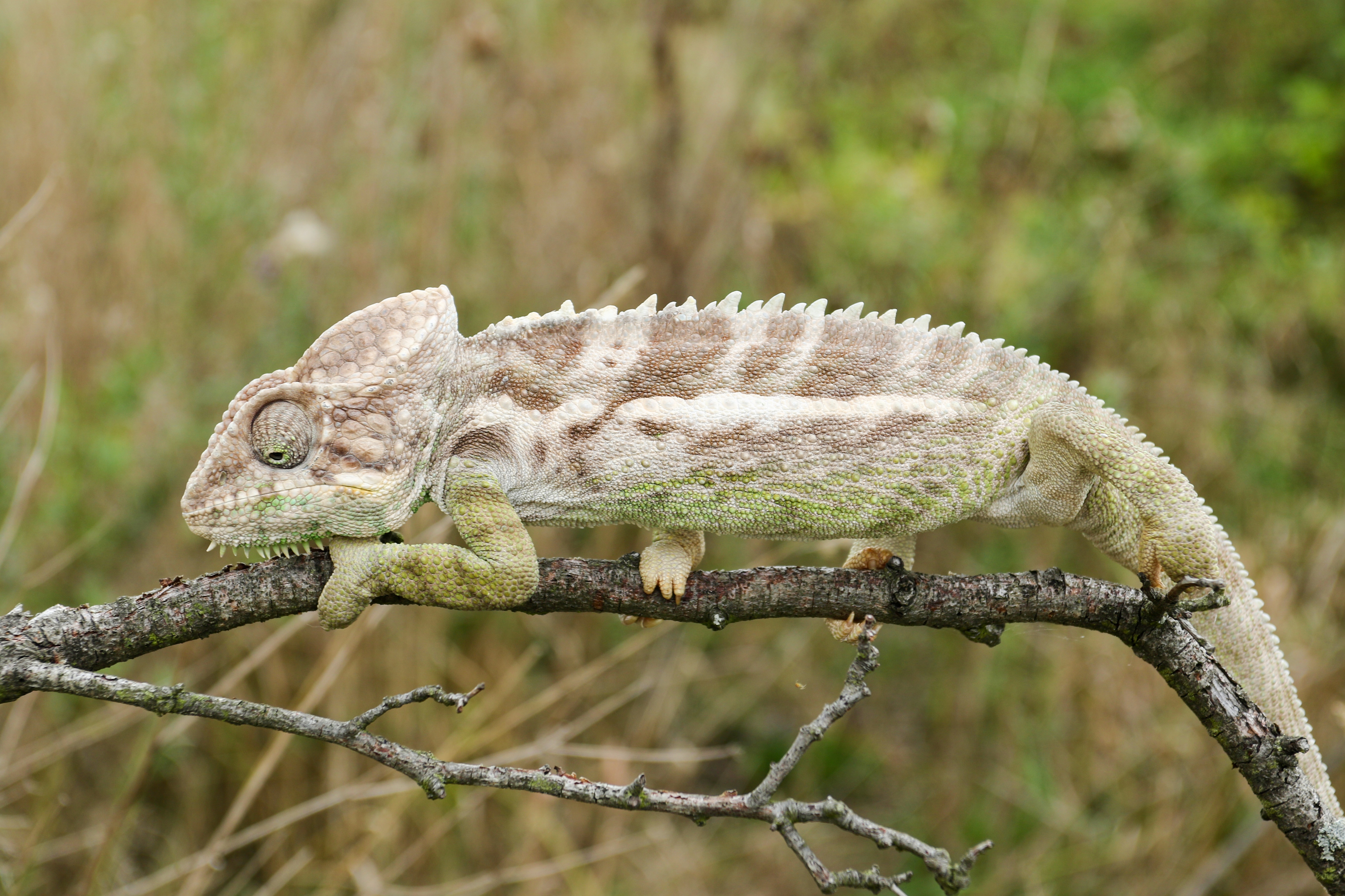 Dospělý samec chameleona bradavičnatého v defenzivním postoji