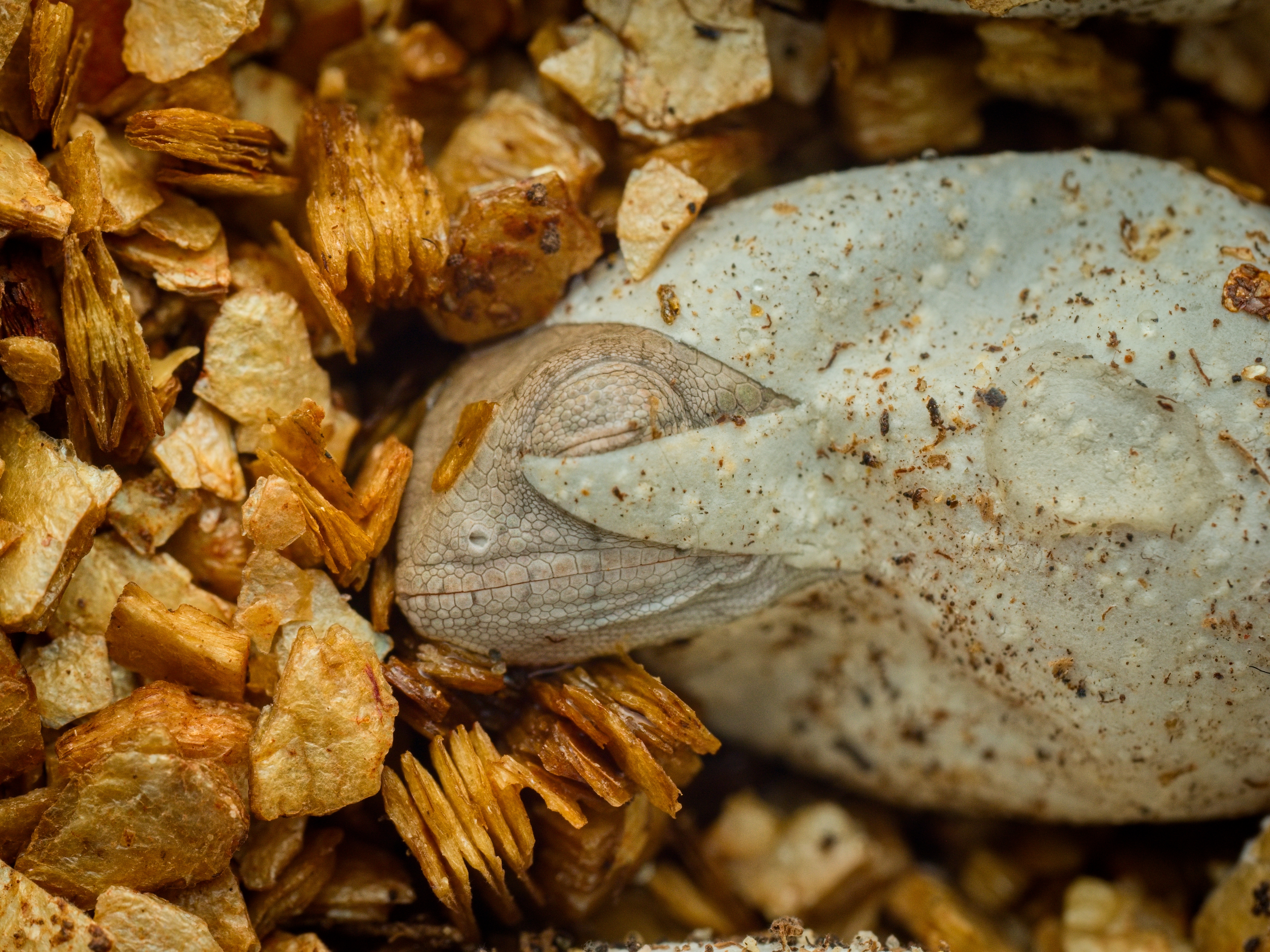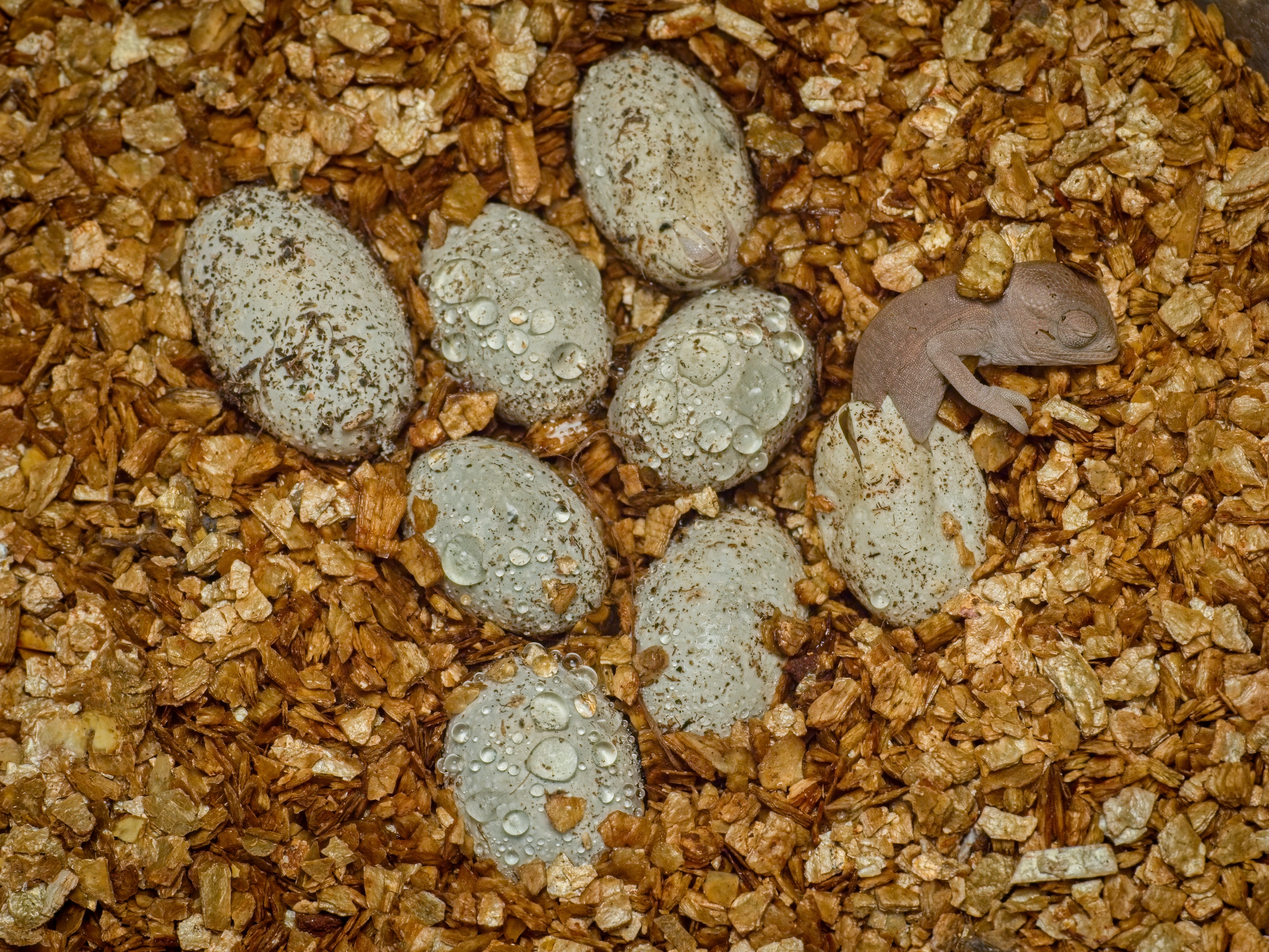 Rozmnožování tohoto druhu v lidské péči je podmíněno precizním nastavením prostředí. Inkubace vajec v teráriu trvá přibližně 231 dní (naše zkušenost) a během této doby je nezbytné simulovat přirozené podmínky včetně teplotních výkyvů – vejce jsou na zhruba 1,5 měsíce ochlazena až na 16 °C, což je klíčové pro správný vývoj embryí. Po zbytek inkubační doby je pak nutné udržovat stabilní teplotu a vlhkost. Samotné líhnutí je pomalý a citlivý proces, kdy mládě může skořápku protrhávat i desítky hodin. Čerstvě vylíhlí jedinci jsou velmi drobní a extrémně citliví na jakékoli výkyvy podmínek.