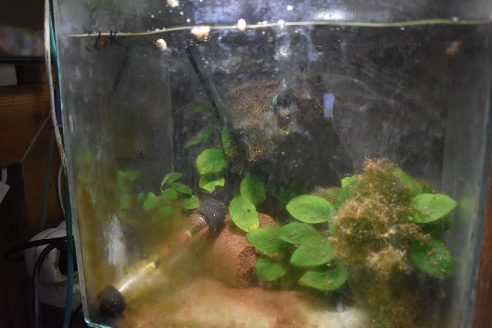 Přibližně 40l akvárko kde žila odchytová samice po dobu několika měsíců a kde porodila první i druhý vrh mladých, akvárium je úmyslně porostlé řasou, která navozuje pocit většího bezpečí pro "divokou" samici.
