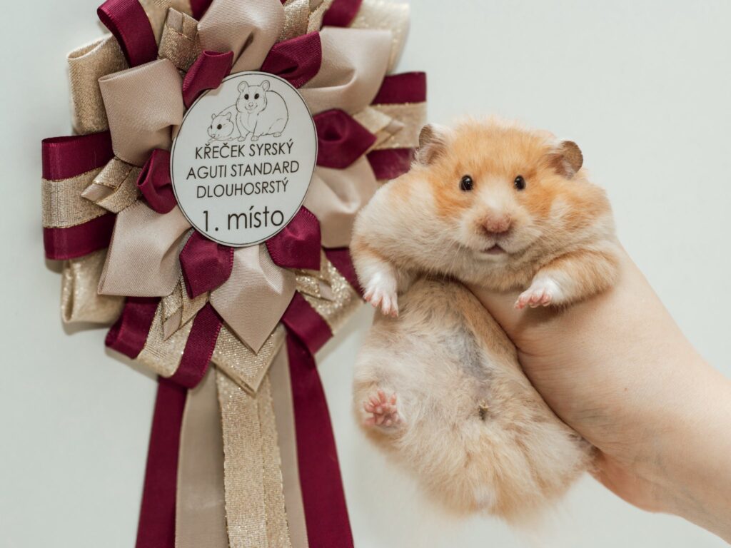 1. místo v kategorii "Křeček syrský aguti standard dlouhosrstý" vyhrál Goldline's Cinccino • Foto: Miroslav Šiagi a Kateřina Palounková
